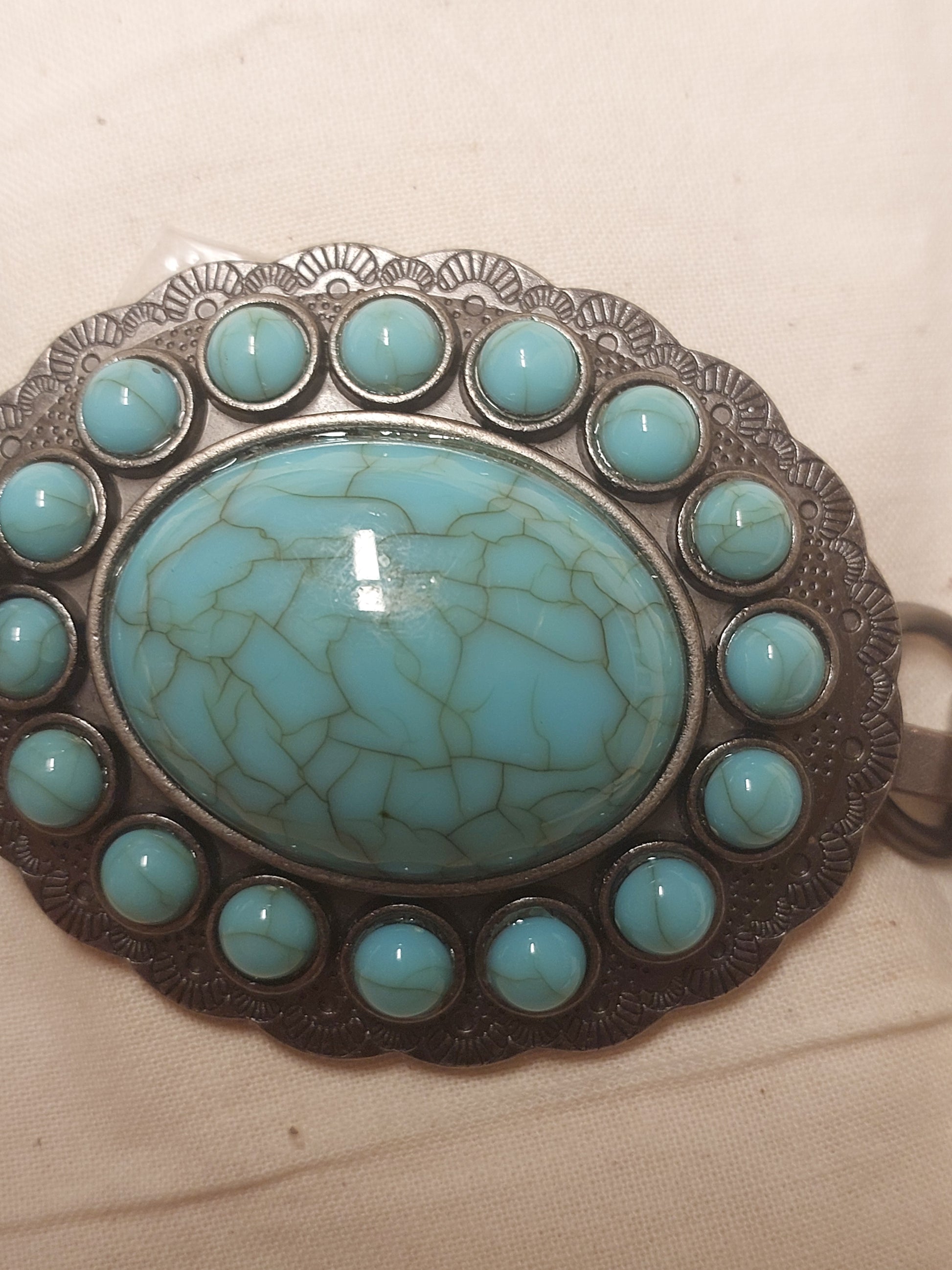A bold vintage-style concho belt featuring turquoise-look plastic stones set in detailed silver-tone medallions. Western, bohemian, and made to be worn low on the hips or styled over dresses, denim, or knits.