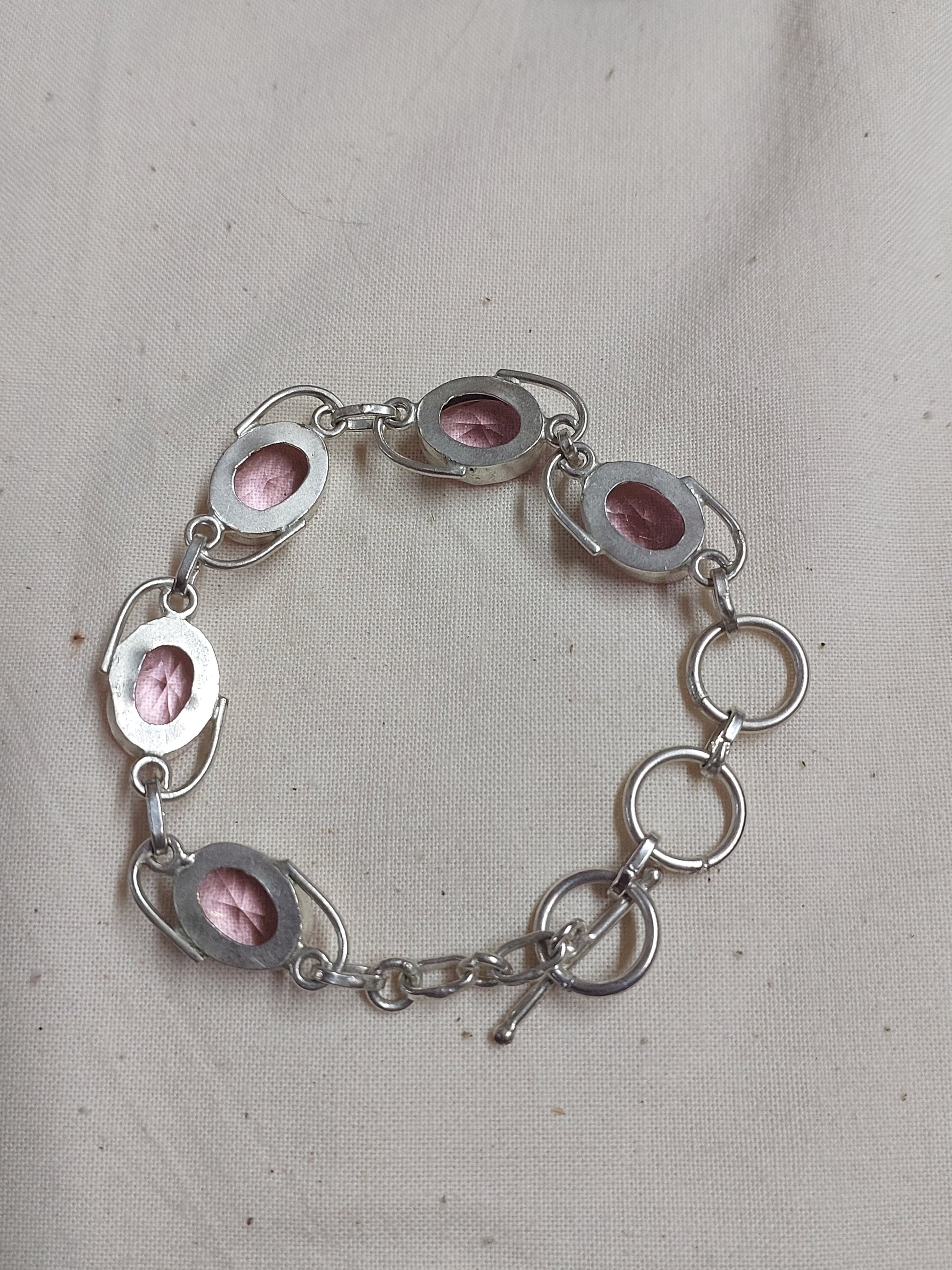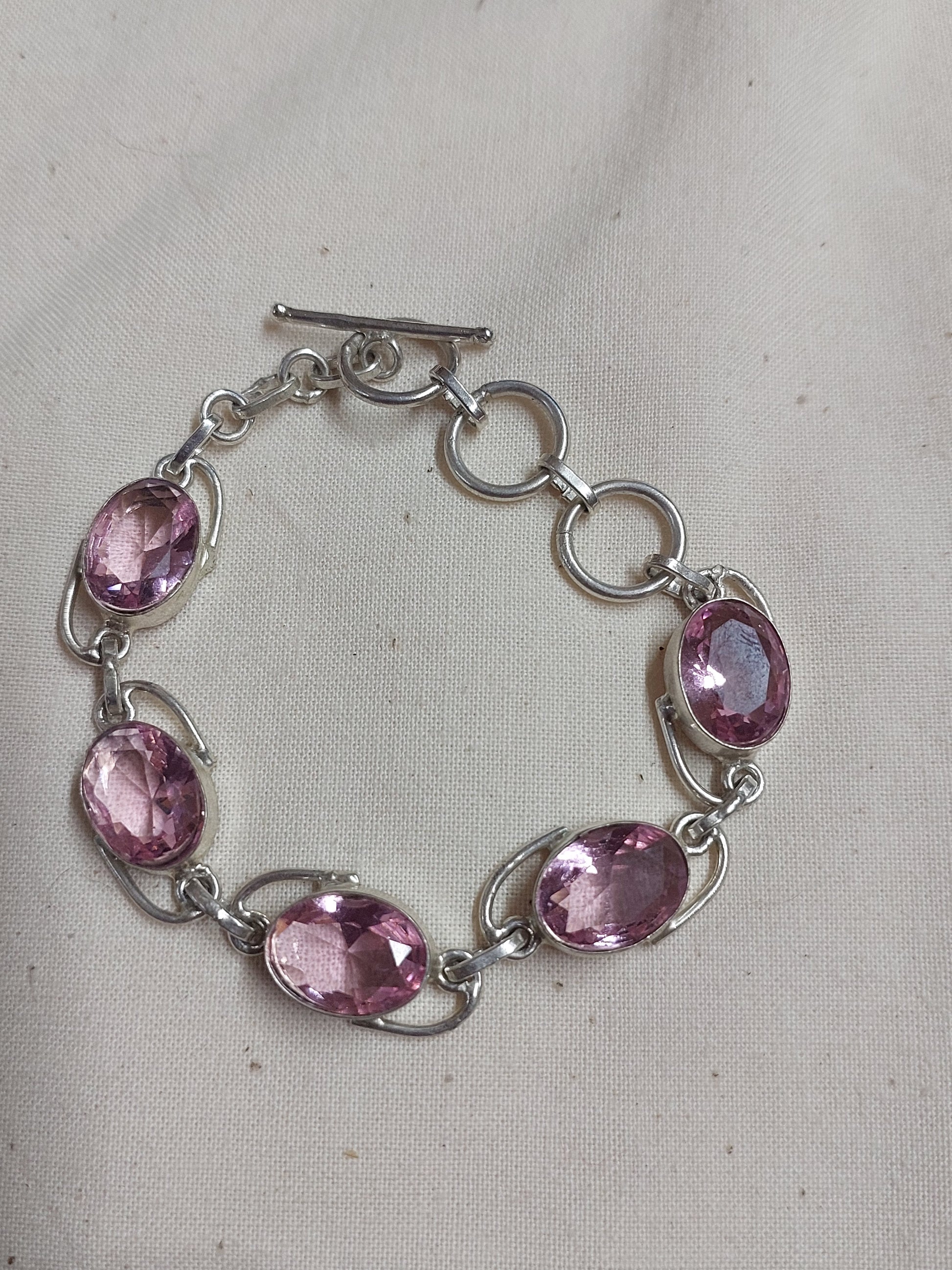 A beautiful silver-tone bracelet featuring sparkling faceted pink crystals set in smooth oval bezels. Finished with an adjustable toggle clasp and decorative link design, this piece adds a soft feminine touch to any outfit.