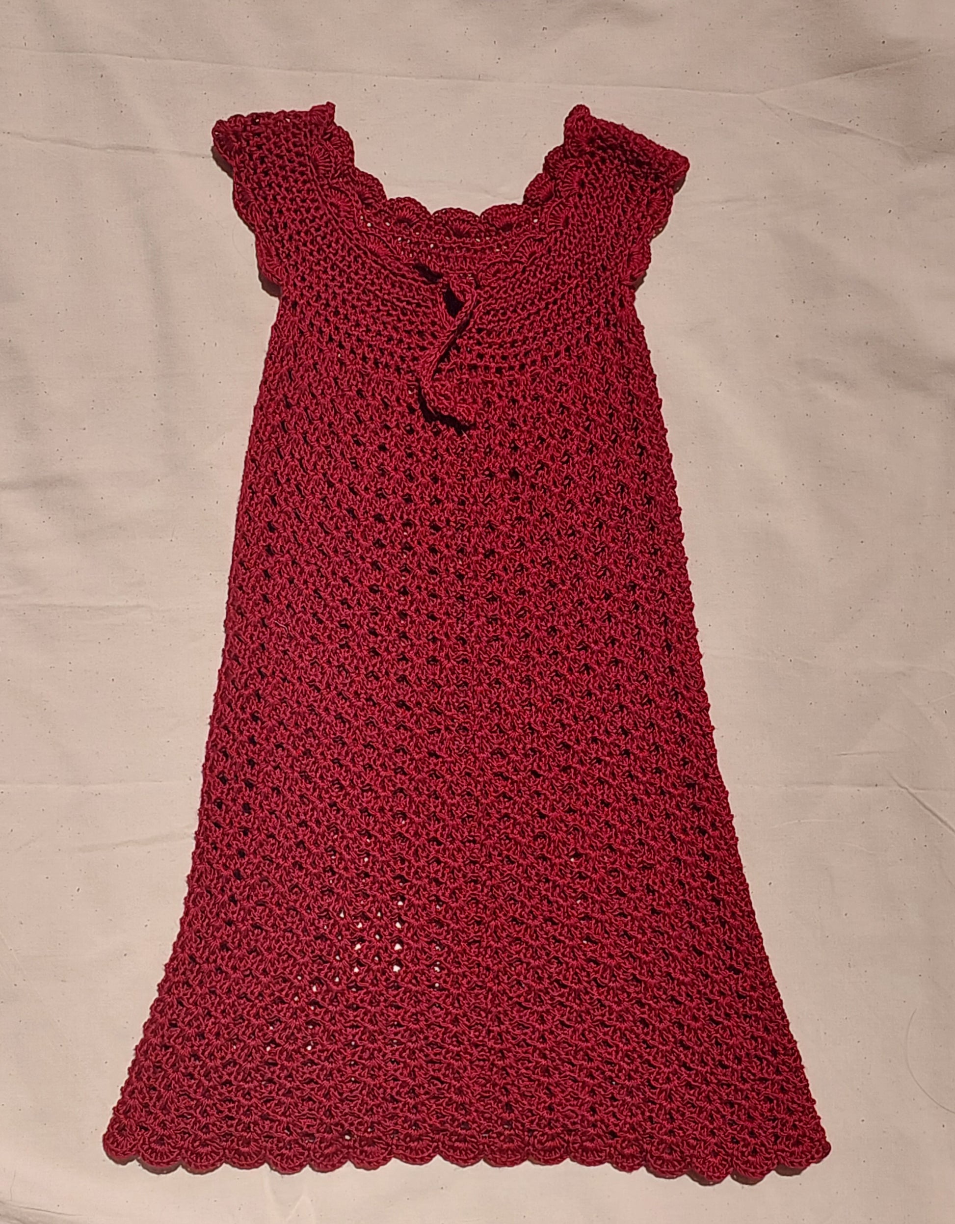 Handmade with love, this deep red Little Wildflower crochet dress is a timeless keepsake piece for your little one. Crafted in a soft, breathable open-shell stitch, it drapes beautifully while offering gentle stretch and comfort. The flutter sleeves and scalloped hem bring a sweet vintage charm, perfectly paired with the warm, earthy tones of the Wildflower Road aesthetic.