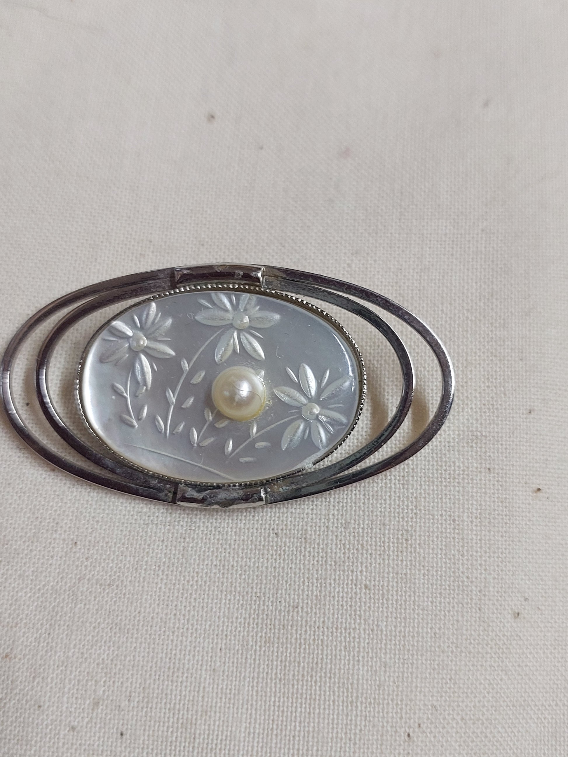 Silver toned Mother of Pearl & Pearl Brooch
