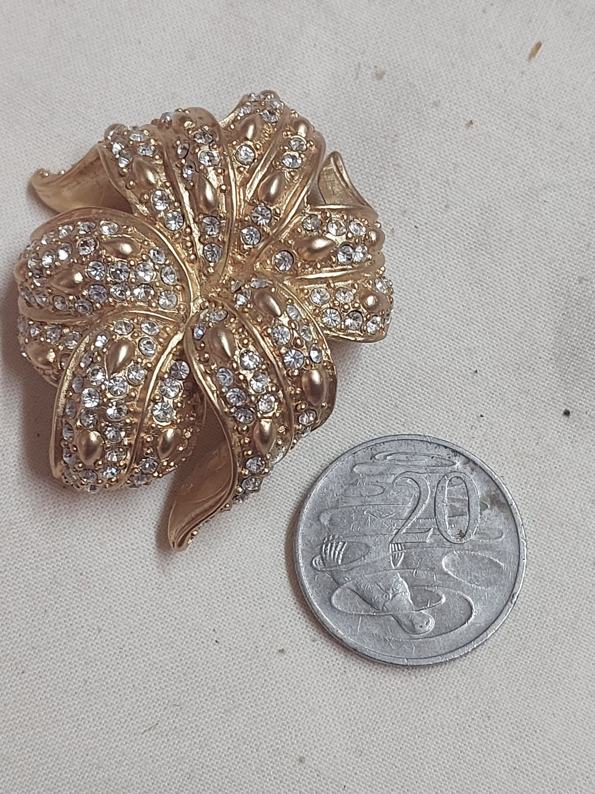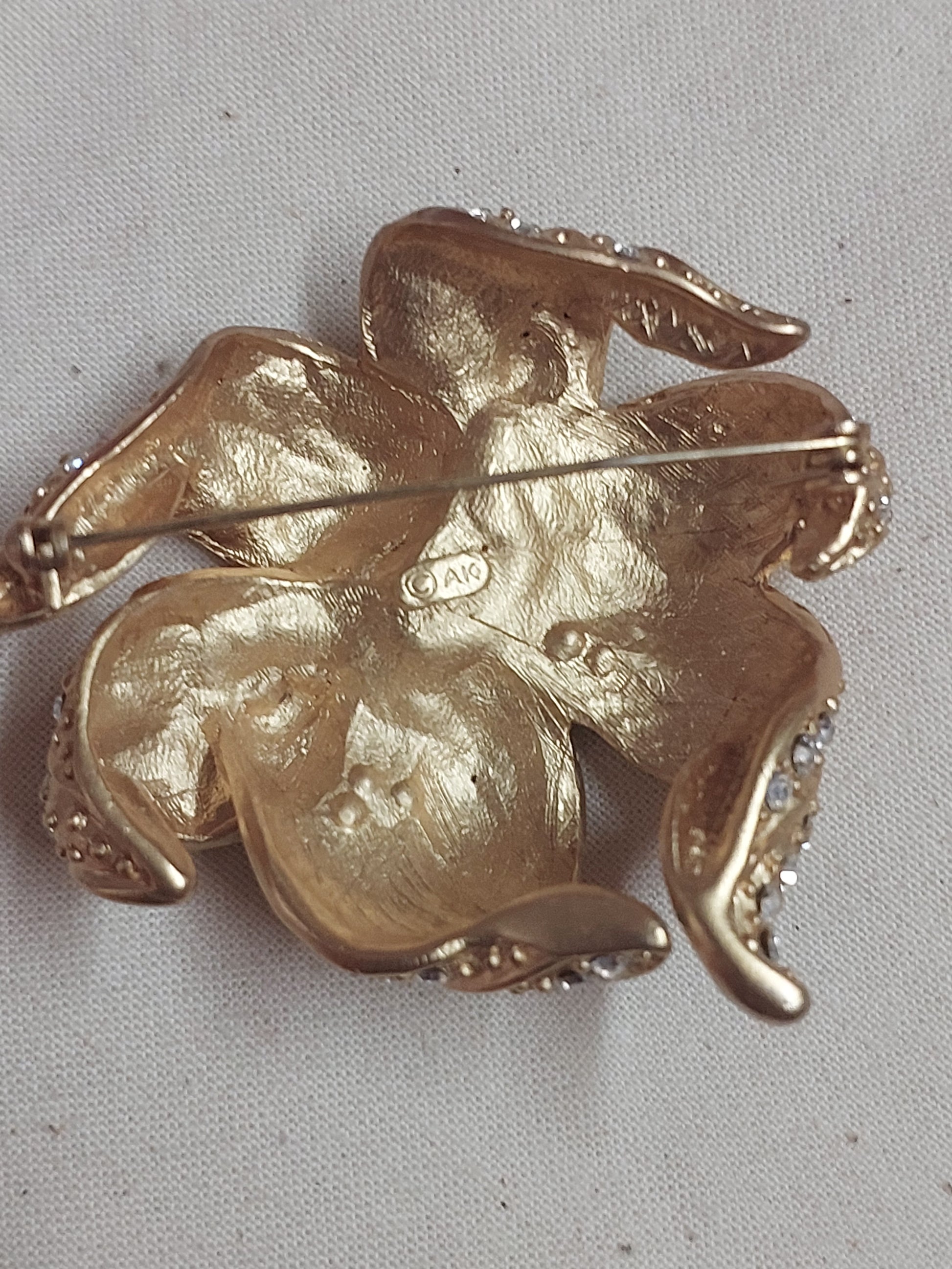 Vintage Designer · Anne Klein Jewellery · Statement Brooch · Floral Pin · Gold Tone · Rhinestone · Retro Glam