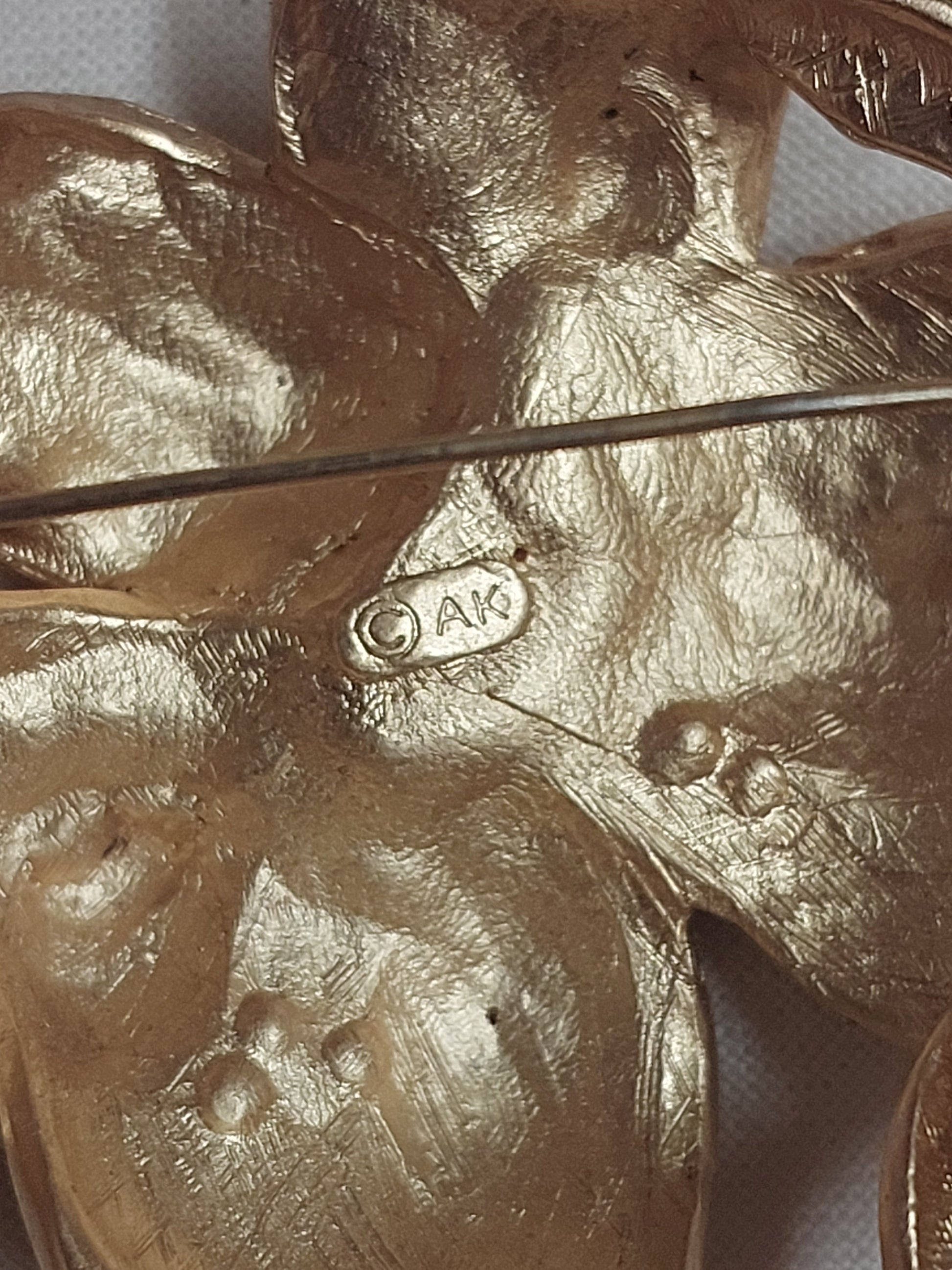 Stamped © AK to the reverse, this brooch dates to the late 1970s–1980s and was created as a fashion-forward accessory to elevate jackets, coats, dresses, or scarves.