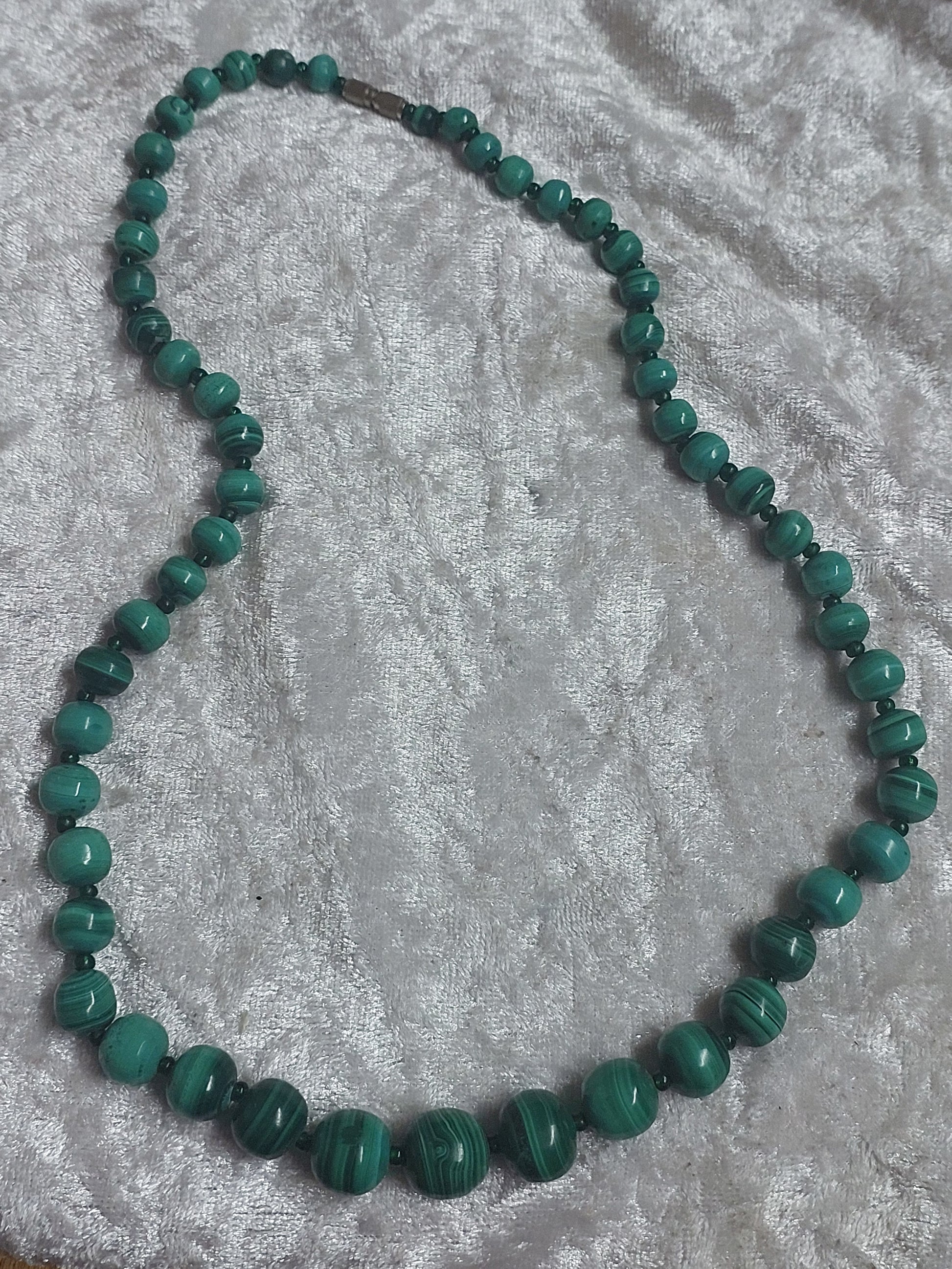 A striking vintage statement necklace crafted from genuine malachite, featuring beautifully graduated beads with rich natural green banding.
