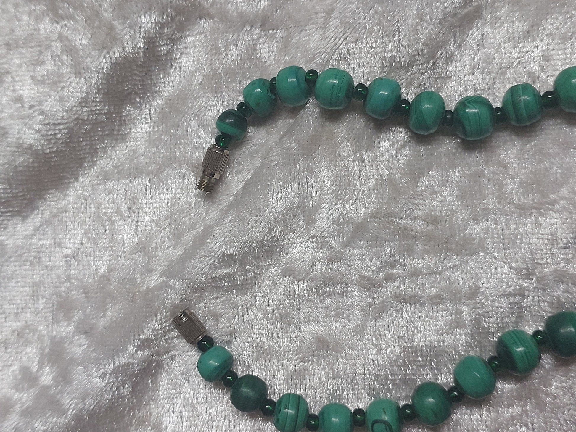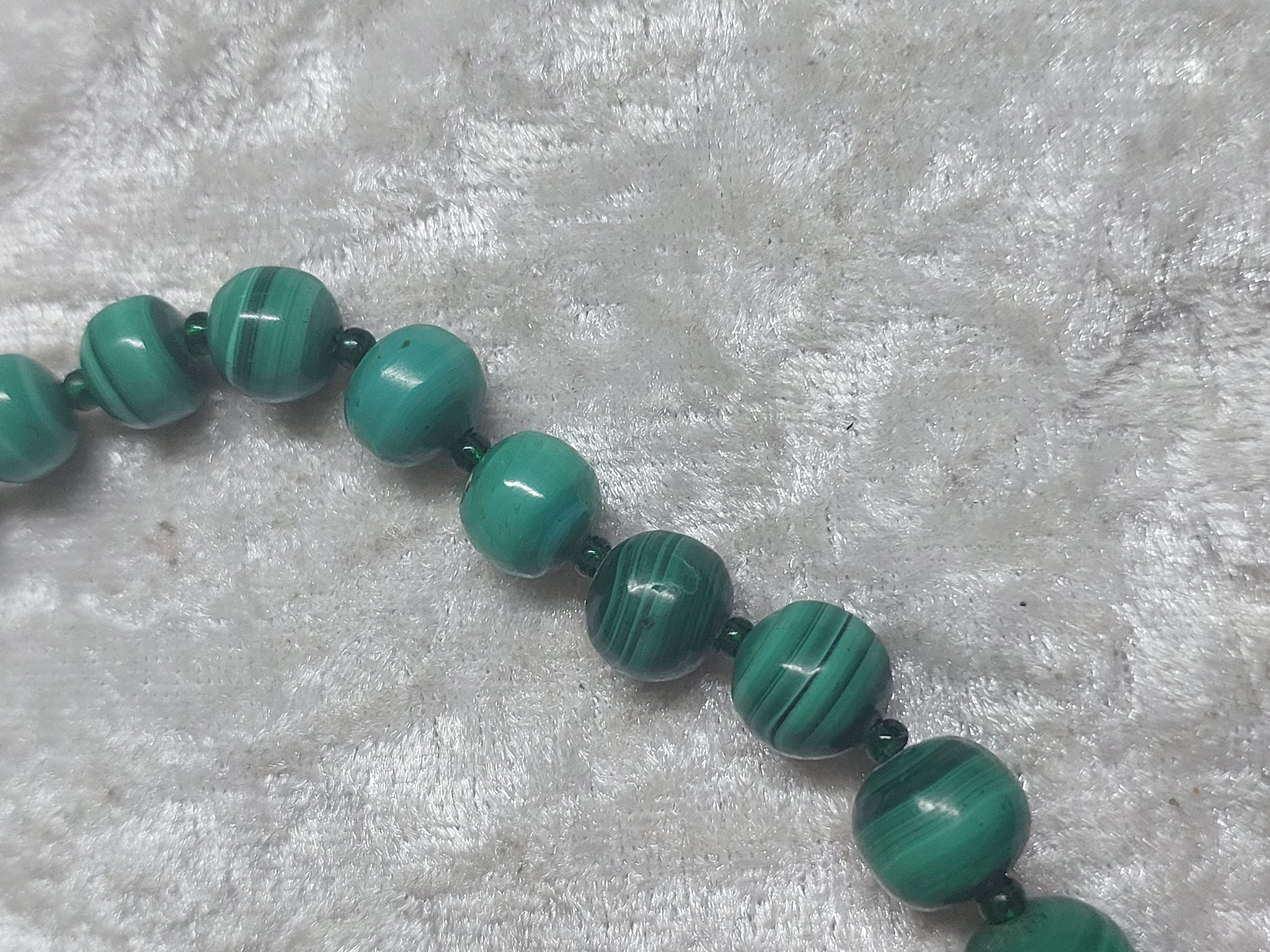 The stone has been tested with a Presidium gemstone tester, confirming it as genuine malachite. As with many vintage malachite beads, the stone may be lightly stabilised to enhance durability — a common and accepted practice.