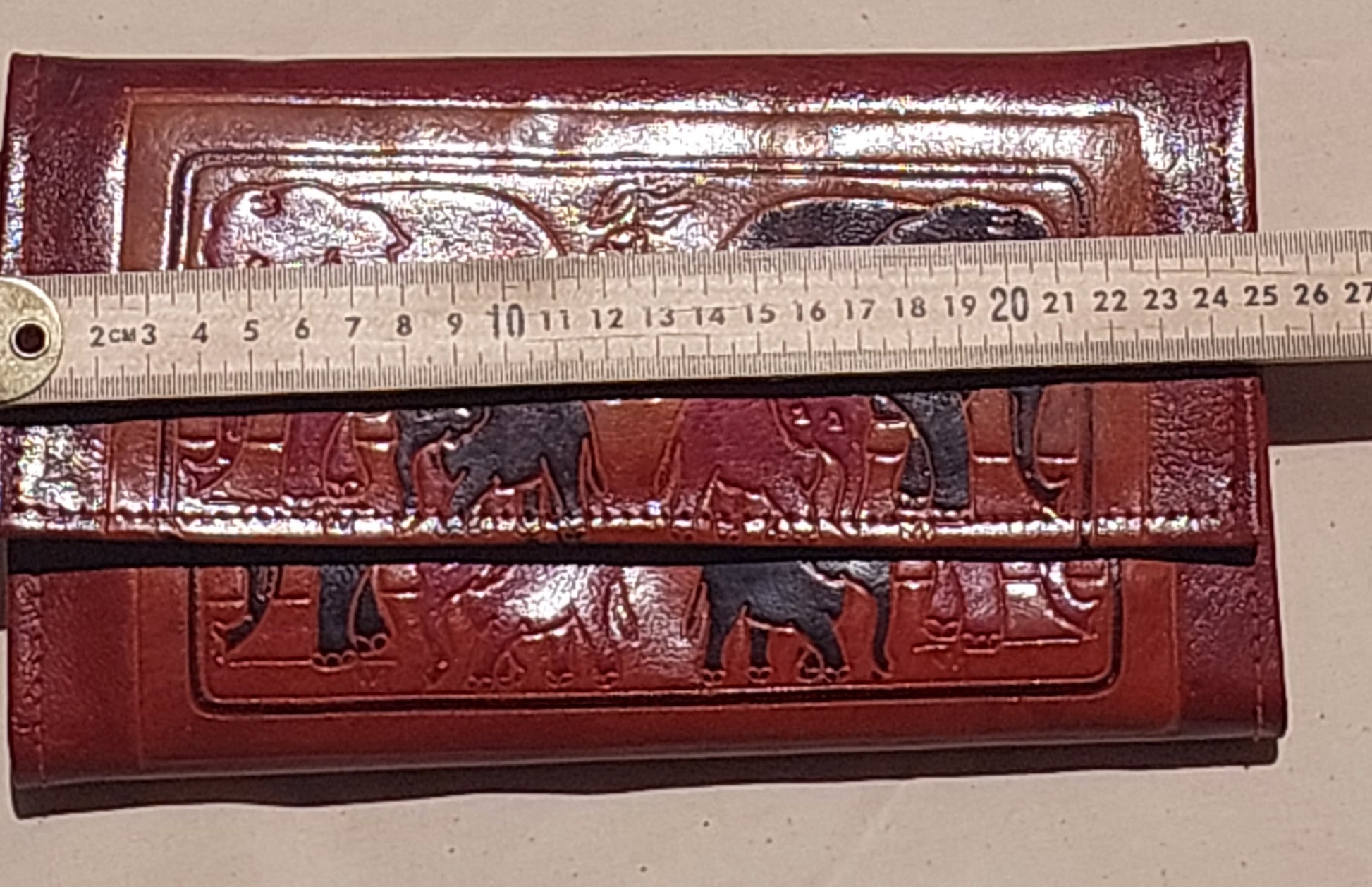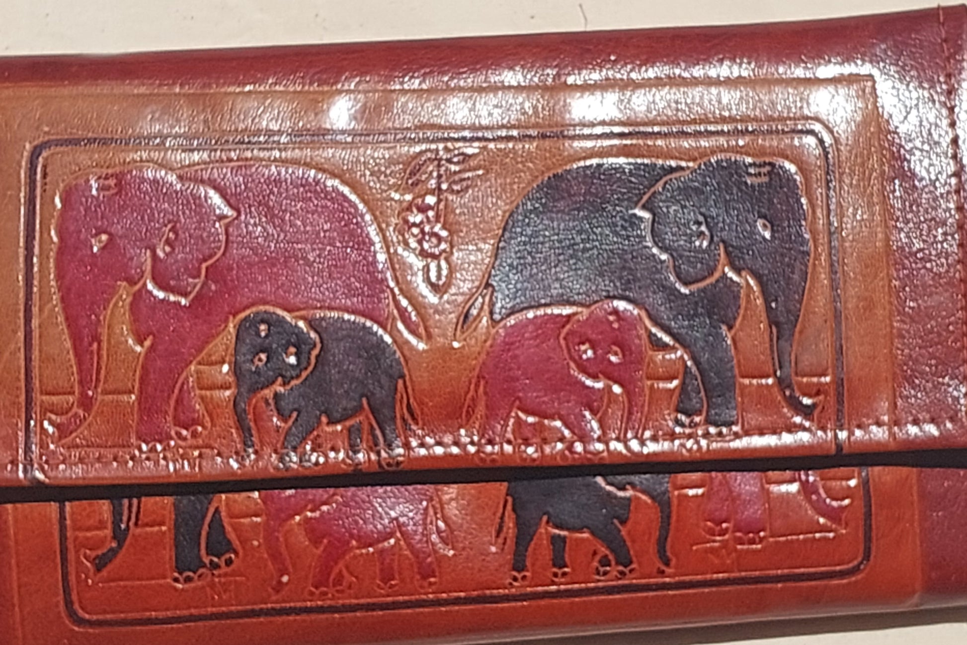 Bring a touch of global boho charm to your everyday essentials with this beautifully hand-tooled leather elephant wallet. Featuring an embossed elephant family across the front in rich earthy tones, this piece is a true reminder of the 80s–90s artisan travel era — when handcrafted leather goods were collected from markets in Thailand, India and Bali.