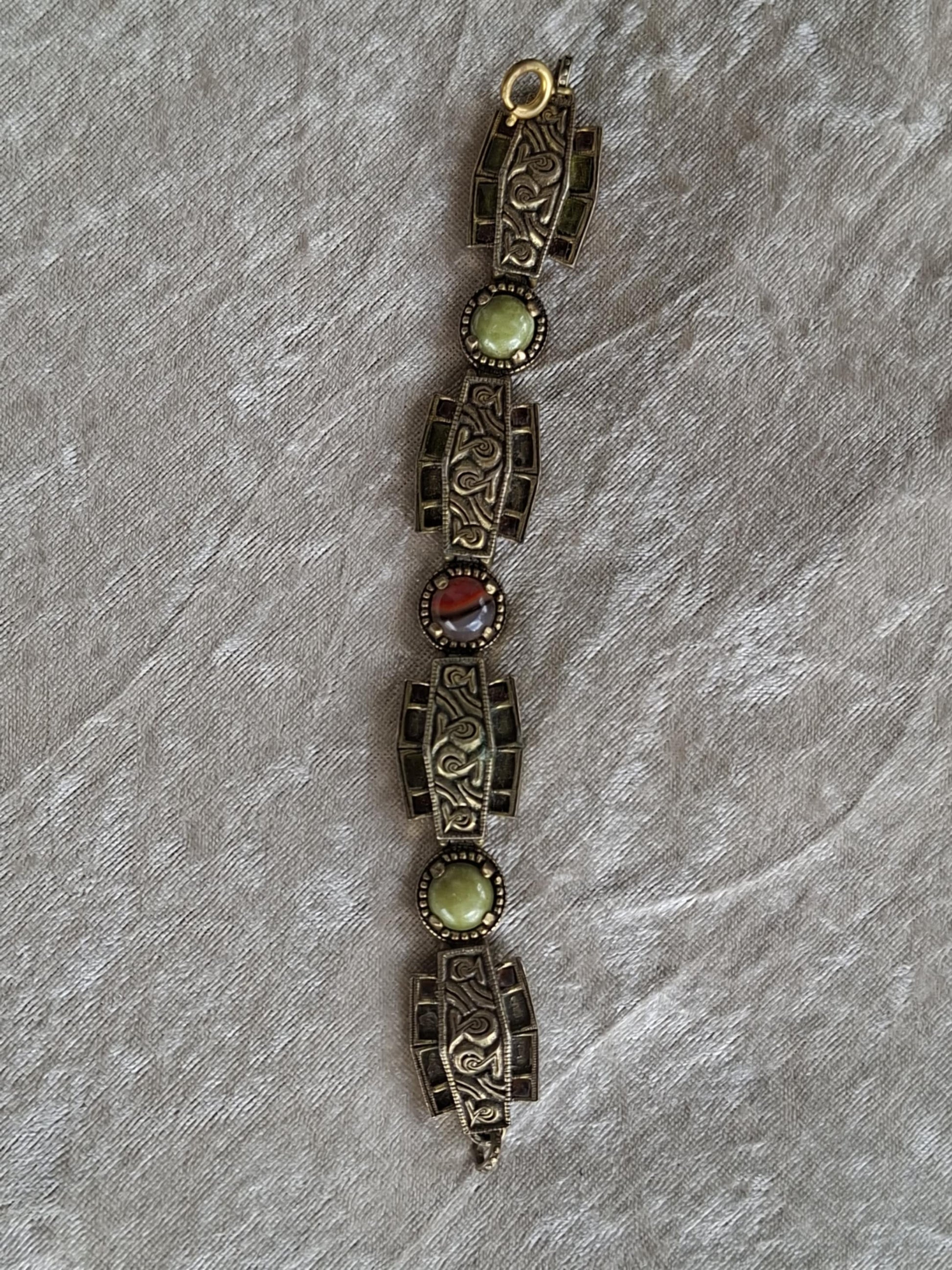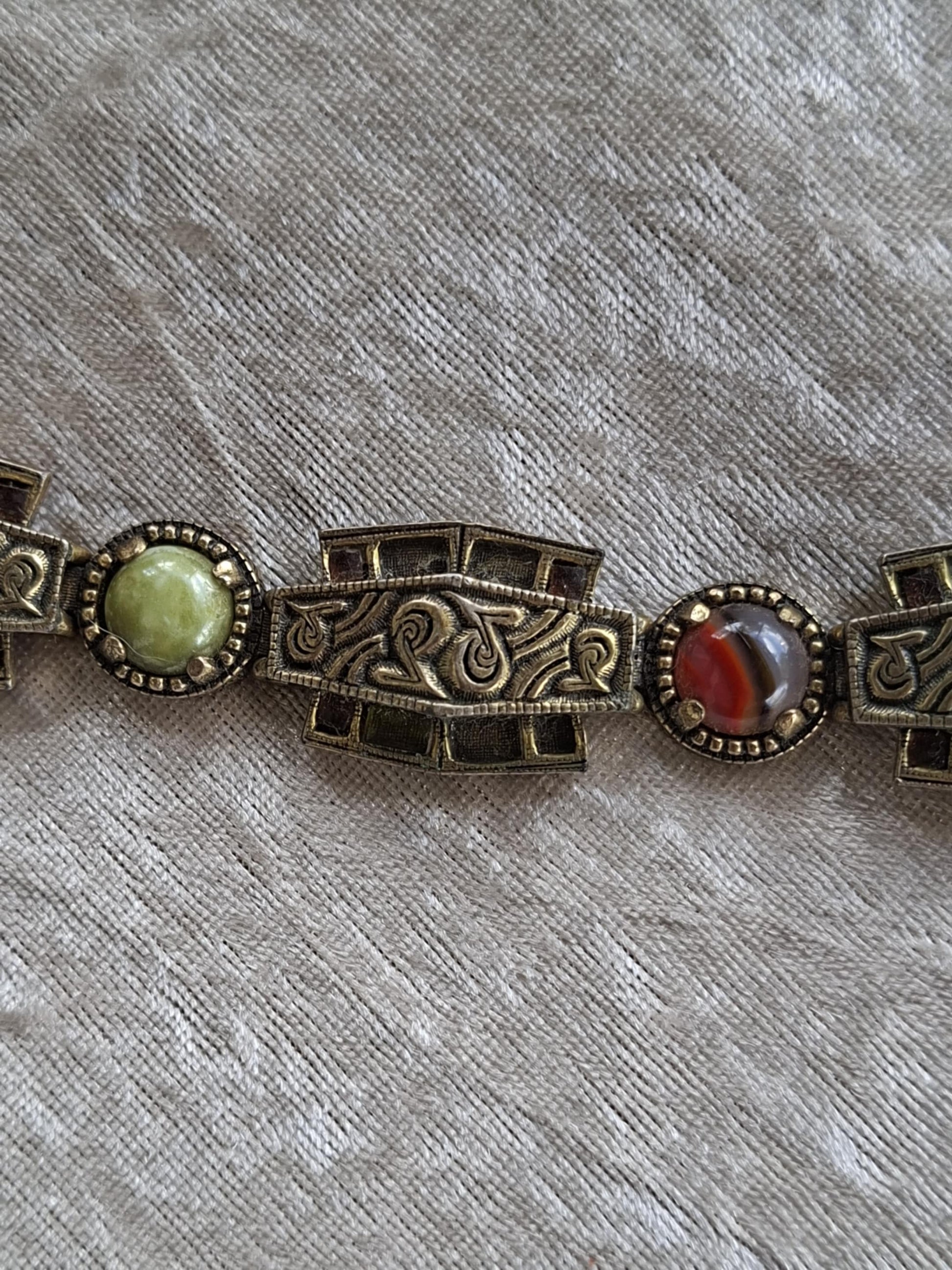 Part of their sought-after Anglo Saxon Collection, this piece features ornate embossed panels inspired by ancient metalwork, paired with rich glass cabochons in soft green and deep agate red tones.