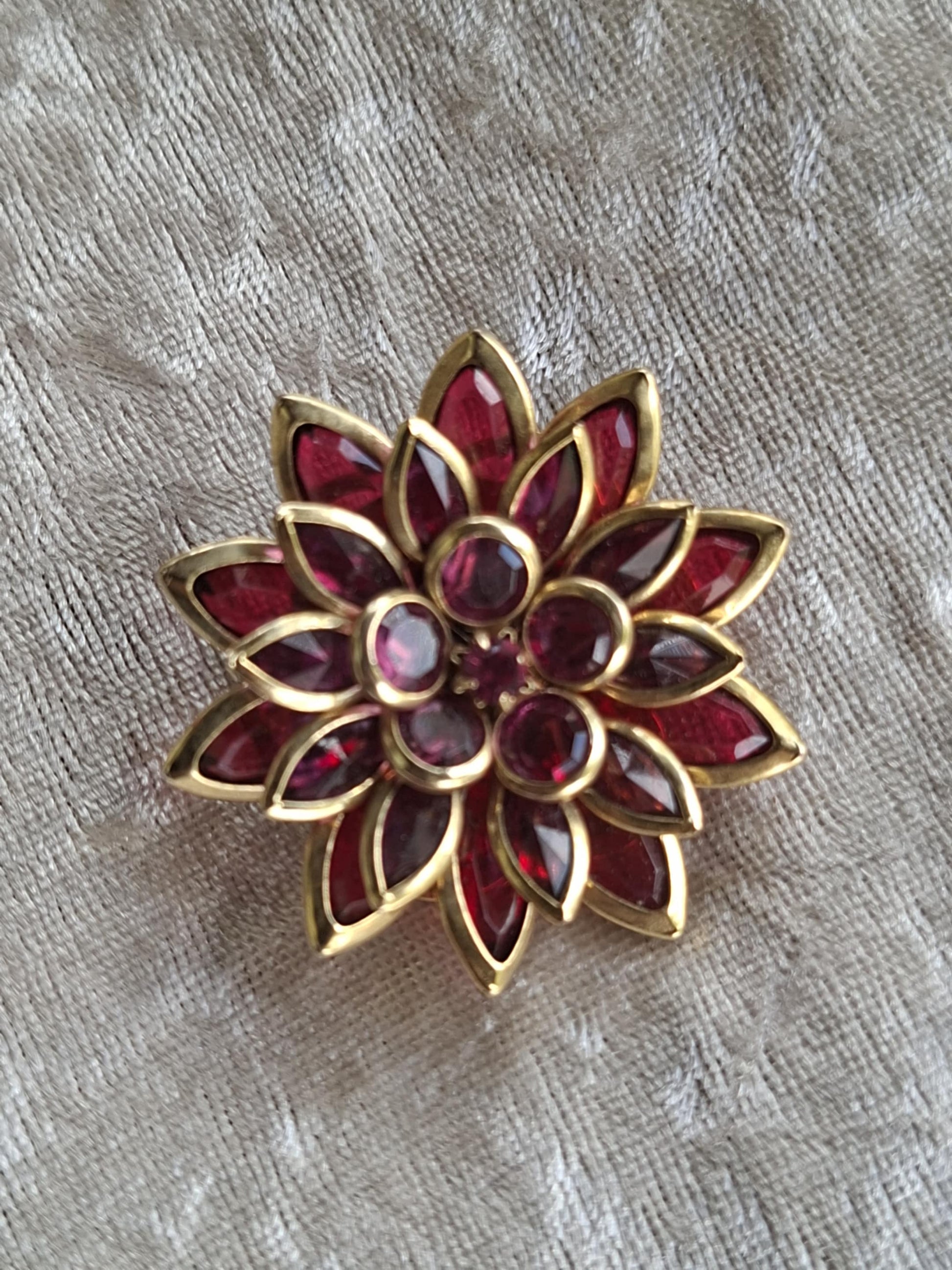 Add a touch of romantic vintage charm to your outfit with this stunning ruby-red floral brooch. Featuring layered marquise and round faceted stones set in warm gold-tone metal, this piece sparkles beautifully and sits like a blooming lotus on the lapel.